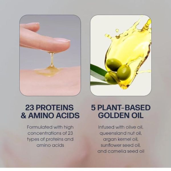 Περιέχει 28 είδη πρωτεϊνών και αμινοξέων όπως υδατοδιαλυτό κολλαγόνο, υδρολυμένο μετάξι, υδρολυμένη κερατίνη , αμινοξέα μεταξιού, 4 είδη υδρολυμένης πρωτεΐνης, 17 είδη αμινοξέων και 5 είδη ελαίων φυτικής προέλευσης – ελαιόλαδο, έλαιο σπόρων μακαντάμια, αργκάν, έλαιο ηλίανθου, έλαιο καμέλιας – συστατικά που παρέχουν πλούσια θρέψη στα μαλλιά, ενώ παράλληλα χαρίζουν λάμψη και απαλότητα.